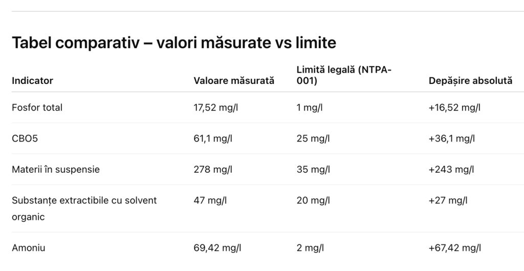 Astfel, rezultatele analizelor efectuate între 11 și 16 februarie 2026 arată depășiri serioase ale limitelor legale stabilite prin norma NTPA-001. Pe scurt: stația nu epurează. Stația scapă.