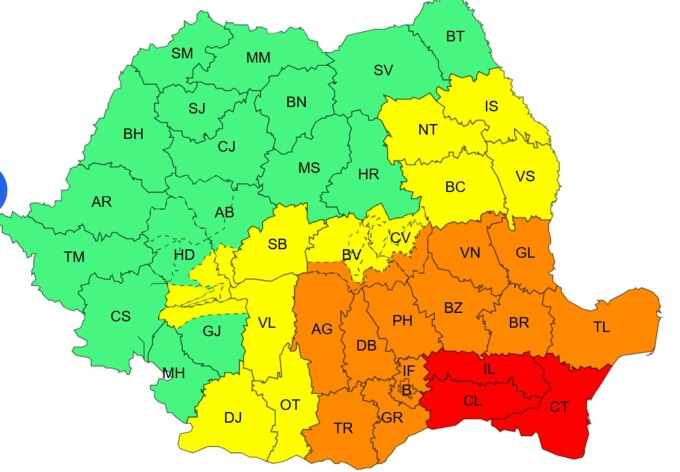 În judeţele marcate cu Cod galben, Vrancea, Galaţi, Buzău, Prahova, Brăila, Ialomiţa, Călăraşi, Constanţa, Tulcea şi Ilfov, dar şi în municipiul Bucureşti, vântul va avea intensificări cu rafale de 50, 70 km/h.