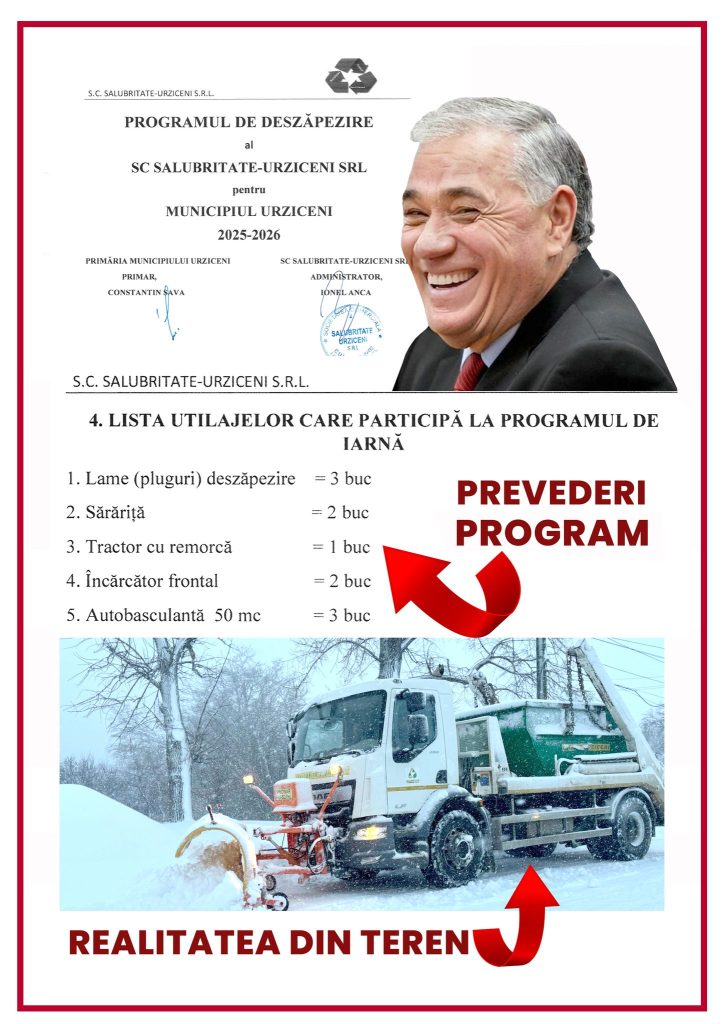 Urziceniul nu a fost surprins de ninsoare. A fost surprins de incapacitatea administrativă a unui primar pe care reflexele birocratice și obișnuința de a lăsa totul în seama altora în momentele critice l-au pierdut în zăpadă. Iar dacă anul viitor programul va fi din nou actualizat prin simpla schimbare a anului din titlu, orașul va rămâne, în esență, deszăpezit la fel: impecabil pe hârtie și paralizat în stradă.
