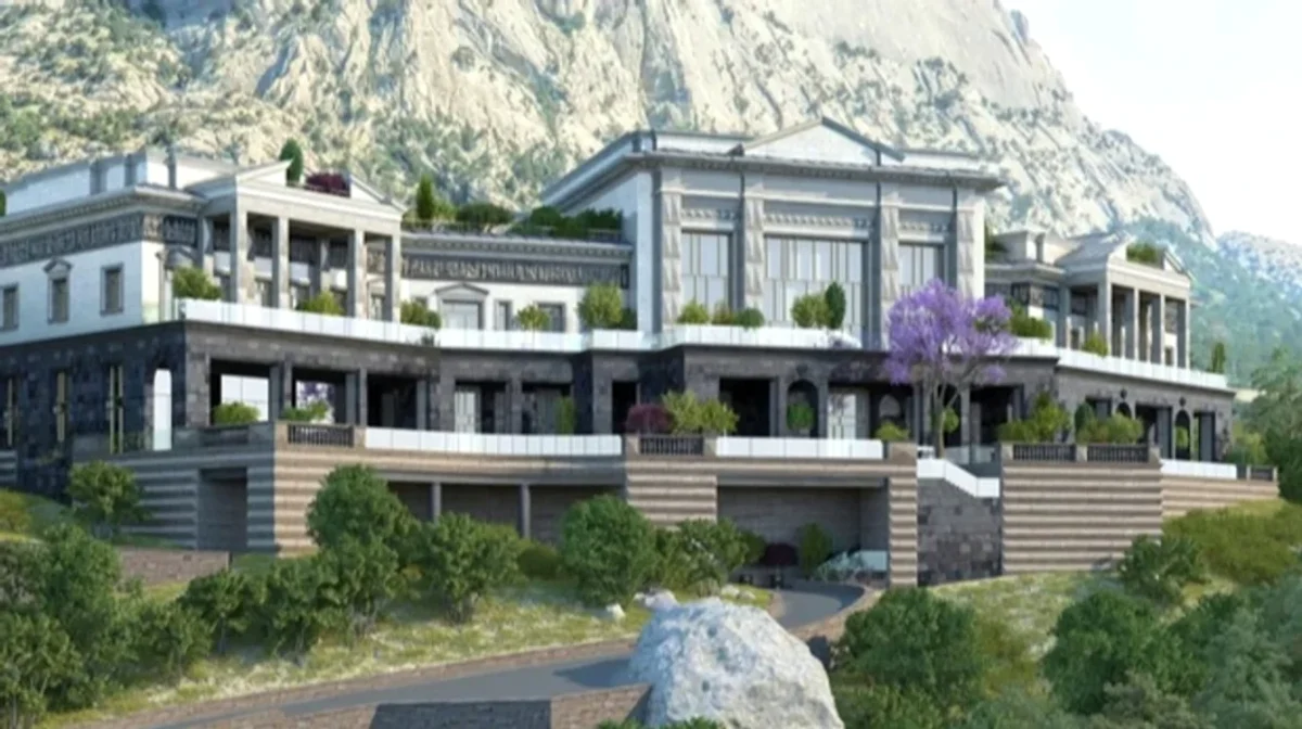 Potrivit FBK, clădirea principală are o suprafață de peste 9.000 de metri pătrați, în timp ce casa de oaspeți se întinde pe aproape 5.000 de metri pătrați. Situl include, totodată, clădiri separate pentru personal, facilități tehnice și un heliport nou construit. Sub proprietate se află o promenadă privată, un debarcader și o plajă artificială cu nisip alb.