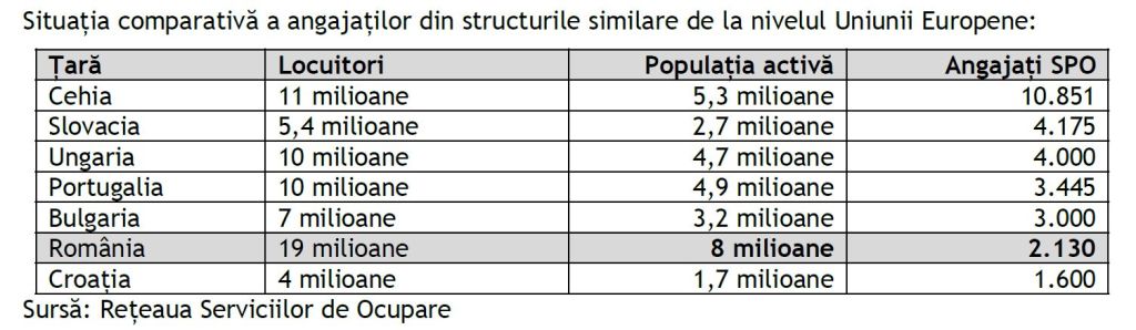 În comparație cu celelalte servicii publice de ocupare din Uniunea Europeană, ANOFM are un număr redus de personal dacă ne raportăm la populația deservită, fiind pe ultimul loc din Uniunea Europeană, raportat la numărul de locuitori, respectiv populaţia activă, se arată în memorandum.
