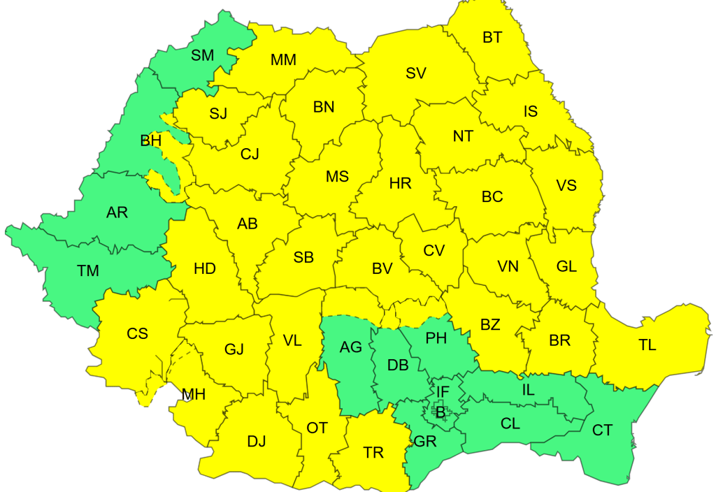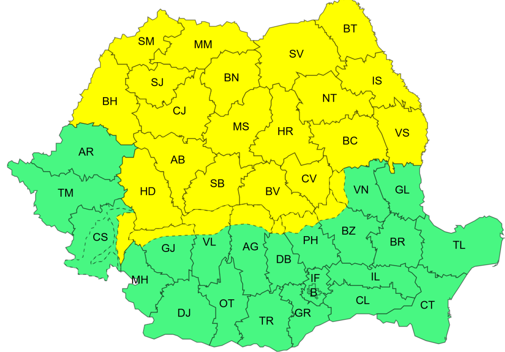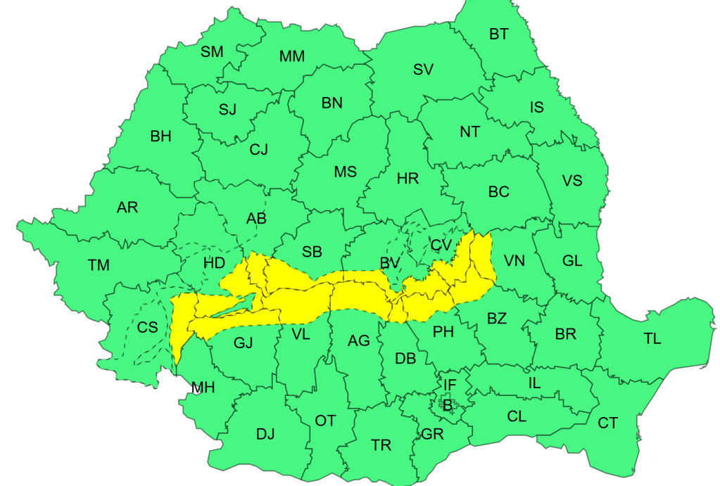 Ulterior, de la ora 21.00 și până mâine, la ora 10.00, este cod galben de vânt în Carpații Meridionali și în Carpații de Curbură. Aici, vântul va avea intensificări cu viteze de 70…80 km/h, iar la altitudini de peste 1700 m vor fi rafale de 90…100 km/h.